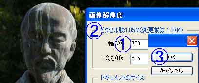(3)@「幅」を「700」(ピクセル)→A「ピクセル数」(1.05M)(変更前は1.37M)→B「OK」 |