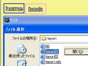 (1)「back」をクリック→「back」が見える位置に、「リンク」・「ファイル選択」ウィンドウを移動