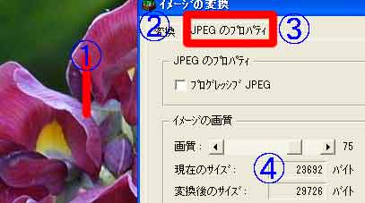(2)B「JPEGのプロパティ」→C「現在のサイズ」は「23632」(約2万)