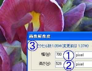 (5)B「ピクセル数」は1.05M(幅を700に変更した時の重さ)→「変更前」(元の画像)は「1.37M」