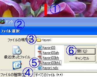(2)B「ファイルの場所」(「tayori」フォルダ)→C「ファイルの種類」は「すべてのファイル(*.*)」