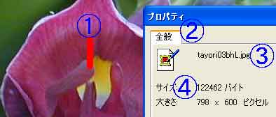 (3)B表示される画像のファイル名「tayori03bhL」→C「サイズ」は「122462」(12万2462バイト) |