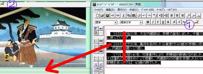 | 写真(2)は、ワードのウェッブ・データの貼り付け結果の画面です。 (1)コピー先のビルダー3画面を見ると、成功です。 (2)写真(2)をソース画面(設計図)で確認します。 |