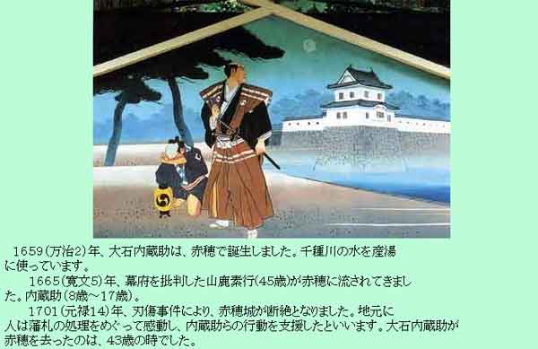 HPB HTML//EN"> <HTML> <HEAD> <META name="GENERATOR" content="IBM HomePage Builder V3.0 for Windows"> <TITLE></TITLE> </HEAD> <BODY bgcolor="#bcfcd8"> <P align="center"> <IMG src="tttopic_ndx_ah.gif" alt="校区の話題" height="66" width="325"> </P> <CENTER> <TABLE width="700" border="0"> <TR> <TD align="center"><IMG src="topic01ah.jpg" height="525" width="700"></TD></TR> <TR> <TD align="center"><IMG src="topic01bh.jpg" height="310" width="465"></TD></TR> <TR> <TD align="left"> 1659(万治2)年、大石内蔵助は、赤穂で誕生しました。千種川の水を産湯<BR> に使っています。<BR> 1665(寛文5)年、幕府を批判した山鹿素行(45歳)が赤穂に流されてきまし<BR> た。内蔵助(8歳〜17歳)。<BR> 1701(元禄14)年、刃傷事件により、赤穂城が断絶となりました。地元に<BR> 人は藩札の処理をめぐって感動し、内蔵助らの行動を支援したといいます。大石内蔵助が<BR> 赤穂を去ったのは、43歳の時でした。</TD></TR> </TABLE> </CENTER> </BODY> </HTML> |