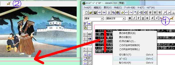 | 写真(2)は、ビルダー3(html)・データの貼り付け結果の画面です。 (1)コピー先のビルダー3画面を見ると、成功です。 (2)写真(2)をソース画面(設計図)で確認します。 |