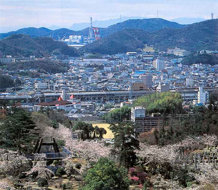 右の写真は山手小学校から見た相生市街・相生湾です