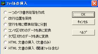 | 写真(2)は、「ファイルの挿入」画面です。 (1)ファイルの挿入(テキスト・タブ区切りテキスト・htmlなどを取り込む) |
