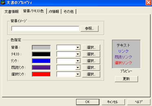 | 写真(6)は、「文書のプロパティ」画面です。 (1)文書のプロパテイ(背景色、テキスト色、リンク色の設定) |
