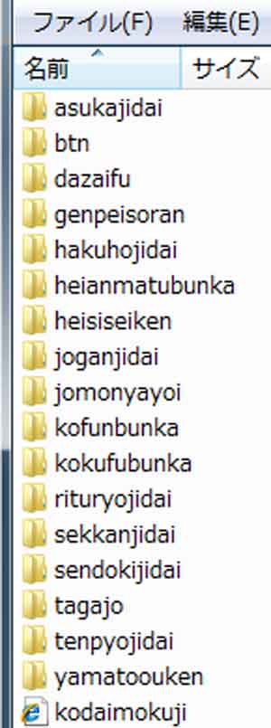 | (1)sendokijidai〜heianmatubunkaまでを名前順にソートしています。 (2)歴史順ではなく、ABCD順に並んでいます。 (3)非常に利用し難い配列になっています。 |
