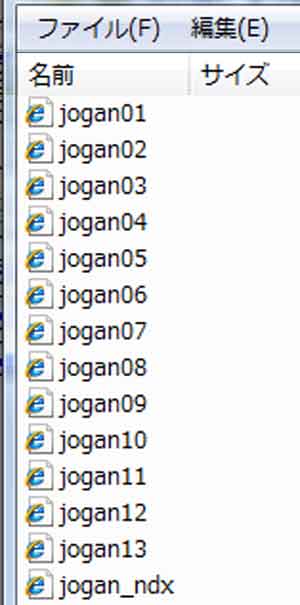 | (1)写真(2)の「09jogan」のフォルダを開いて、ファイル名を確認しています。 (2)「09jogan」フォルダ内のファイル名は、全て「jogan」で統一しています。 (3)「jogan01」は、「jogan」フォルダ内の「01ページ」を意味します。 (4)「jogan13」は、「jogan」フォルダ内の「13ページ」を意味します。 |
