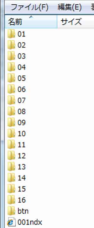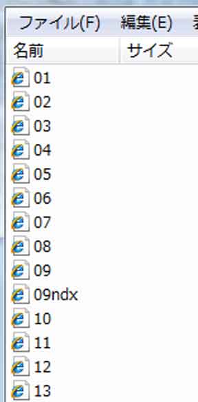 | (1)写真(2)の「09」のフォルダを開いて、ファイル名を確認しています。 (2)「09」フォルダ内の小目次は「01_ndx」となります。「09」フォルダ+小目次(ndx)=ファイル名(09_ndx) (3)「01」は、「09」フォルダ内の「01ページ」を意味します。 (4)「13」は、「09」フォルダ内の「13ページ」を意味します。 |