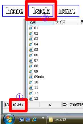 | (1)貞観時代のファイル名一覧です。 (2)@「02.htm」が現在位置(リンク元)です。 (3)A「back」ボタンをダブルクリックします。 (4)現在位置(リンク元)の「02.htm」から1つ戻るファイル名(リンク先)を選択します。 (5)候補が多くても、「02.htm」のバックは「01.htm」です。 (6)「next」も、「02.htm」のネクストは「03.htm」です。 (7)リンクを貼るのにも、何も考えることなく、非常に簡単です。 | ||||||||||||