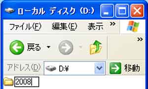 | 写真(3)は、「2008フォルダ」画面です。 (1)「新しいフォルダ」が青地に白字の場合、そのまま入力する(旧字が消えて新字になります)。 (2)フォルダの外をダブルクリックして、フォルダ名を確定する。 (3)「D:」ドライブ内に「2008」フィルダを作成 |