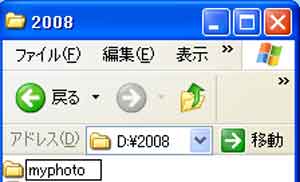 | 写真(5)は、「myphoto」画面です。 (1)「2008」フォルダの (2)写真(3)〜写真(5)を利用して、「myphoto」フォルダを作成します。 (3)「2008」フォルダ内に「myphoto」フィルダを作成 |