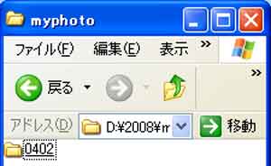 | 写真(6)は、「0402」画面です。 (1)「myphoto」フォルダの (2)写真(3)〜写真(5)を利用して、「0402」フォルダを作成します。 (3)「myphoto」フォルダ内に「0402」フィルダを作成 |