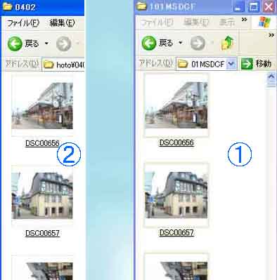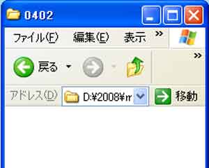 | 写真(7)は、「0402フォルダ」画面です。 (1)「0402」フィルダを開きます。 (2)「0402フォルダ」は「新規作成」したフォルダですから、データは何もありません。 (3)ここにデジカメ写真をコピー・貼り付けします。 |