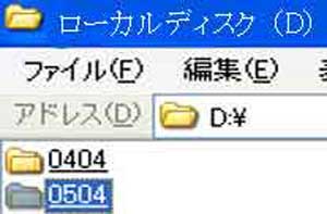 | 写真(8)は、「0404」フォルダ画面です。 (1)「0504」のフォルダが完成→「0504」フォルダを開きます。 (2)開かれた新規の「0504」フォルダにはデータがありません。 |