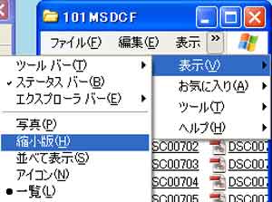 | 写真(6)は、「表示」→「縮小版」に変更画面です。 (1)「表示」→「縮小版」(表示を「一覧」から「縮小版」に変更します)。 |