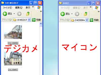 | 写真(7)は、「デジカメとマイコン」画面です。 (1)左側がデジカメ画面(フォルダ名が「101MSDCF」)です。 (2)右側がマイコン画面(フォルダ名が「0402」)です。 |