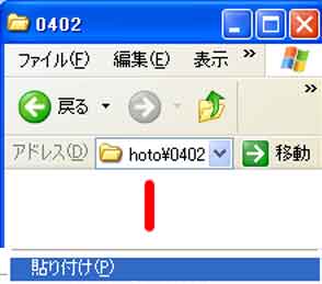 | 写真(2)は、「1枚の写真を貼り付け」画面です。 (1)右側のマイコンの「0402」フォルダの空白部分を右クリック→「貼り付け」 |