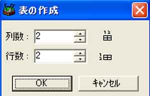 | 写真(2)は、「表の作成(2)」画面です。 (1)初期設定では、「列数」(2)、「行数(2)」→「OK」 |