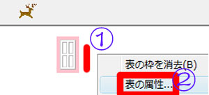 | 写真(1)は、「表の属性」画面です。 (1)@「表」のやや離れた真右を右クリックします。 (2)A「表の属性」をクリックします。 |