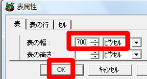 | 写真(2)は、「表の幅」です。 (1)「表の幅」を「700」(半角)「ピクセル」→「OK」 |