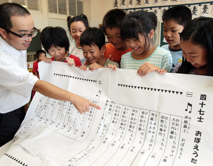 | 長安健太教諭=左端=が作詞作曲した「四十七士おぼえうた」で義士の名前を覚える子どもたち |