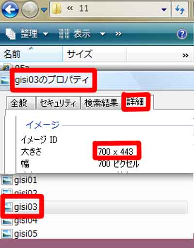(2)「詳細」→「イメージ」の「大きさ」→「700×443」(700は幅、443は高さ)をメモします。