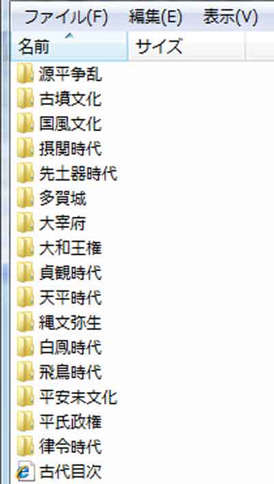 | (1)先土器時代〜平安末文化までを名前順にソートしています。 (2)歴史順ではなく、あいうえお順に並んでいます。 (3)非常に利用し難い配列になっています。 |