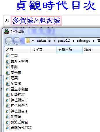 | (1)貞観時代のファイル名一覧です。 (2)「多賀城と胆沢城」がリンク元です。 (3)候補からリンク先の「多賀城」を選択します。 (4)数が多く、順番があいうえお順なので、探しにくい。 |