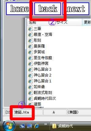 | (1)貞観時代のファイル名一覧です。 (2)@「建築.htm」が現在位置(リンク元)です。 (3)A「back」ボタンをダブルクリックします。 (4)現在位置(リンク元)の「建築.htm」から1つ戻るファイル名(リンク先)を選択します。 (5)候補の数が多いので、「建築.htm」の前のファイル名(リンク先)をメモしないと探せません。 (6)リンクを貼るのに非常に苦労します。 (7)半角英数が世界標準です。ホームページとしてアップ出来ません。 |