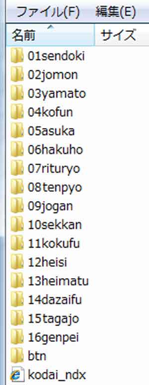 | (1)01sendoki〜16genpeiまでを名前順にソートしています。 (2)フォルダ名に01〜16を付したので、歴史順に並んでいます。 (3)非常に利用し易い配列になっています。 |