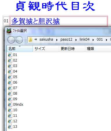 | (1)貞観時代のファイル名一覧です。 (2)@「02.htm」が現在位置(リンク元)です。 (3)A「back」ボタンをダブルクリックします。 (4)現在位置(リンク元)の「02.htm」から1つ戻るファイル名(リンク先)を選択します。 (5)候補が多くても、「02.htm」のバックは「01.htm」です。 (6)「next」も、「02.htm」のネクストは「03.htm」です。 (7)リンクを貼るのにも、何も考えることなく、非常に簡単です。 | ||||||||||||