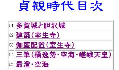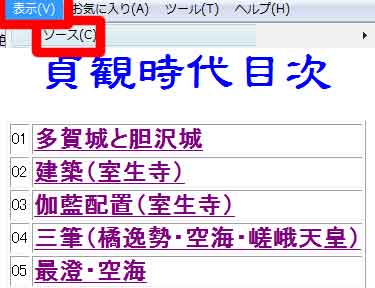 | (1)「09ndx-メモ帳」とは、貞観時代目次のソース(設計図)です。 (2)どのような構造かが把握できます。 (3)<TD align="left">01</TD>とは、写真(2)の番号「01」のことです。 (4)<A href="01.htm">多賀城と胆沢城</A>とは、「多賀城と胆沢城」がリンク元、「01.htm」がリンク先です。つまり、「多賀城と胆沢城」をクリックすると、「01.htm」にリンクするということです。 (5)<TD align="left">05</TD>とは、写真(2)の番号「05」のことです。 (6)<A href="05.htm">最澄・空海</A>とは、「最澄・空海」がリンク元、「05.htm」がリンク先です。つまり、「最澄・空海」をクリックすると、「05.htm」にリンクするということです。 | ||||||||||||