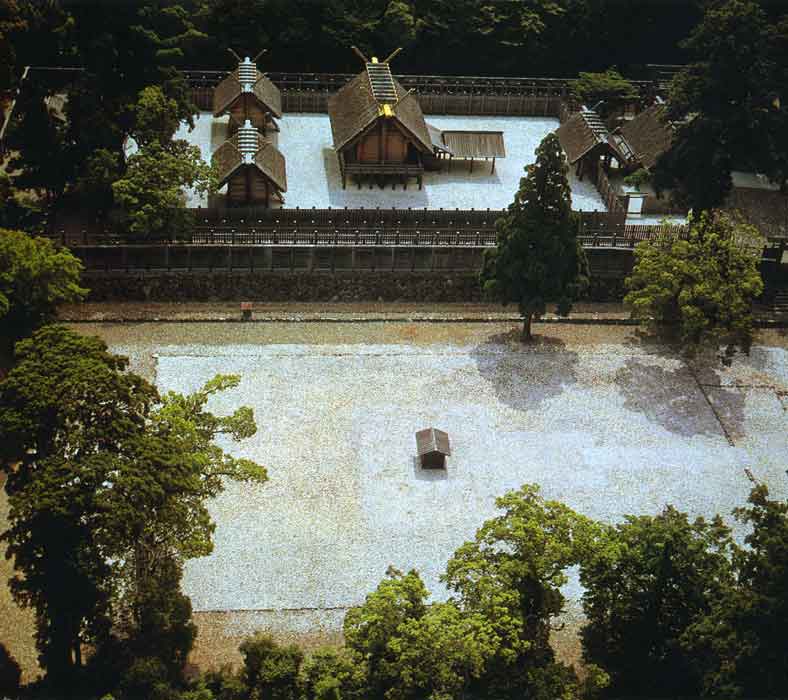 深い森に囲まれた皇大神宮(内宮)に隣接した古殿地の小さな覆屋(写真手前中央)には、この神宮でもっとも重要視される「心御柱」が埋められている。この柱は、正殿の床下中央に埋められるもので、神が天から降臨する際にとりつく「神蔽」として位置づけられている。20年ごとにすべての殿舎を隣の殿地に造りかえる式年遷宮のときでも、この心御柱は柱を保護する覆屋とともに残され、次の造営に先立って建て直される。かつては柱の上部は地上に出ていたらしい。