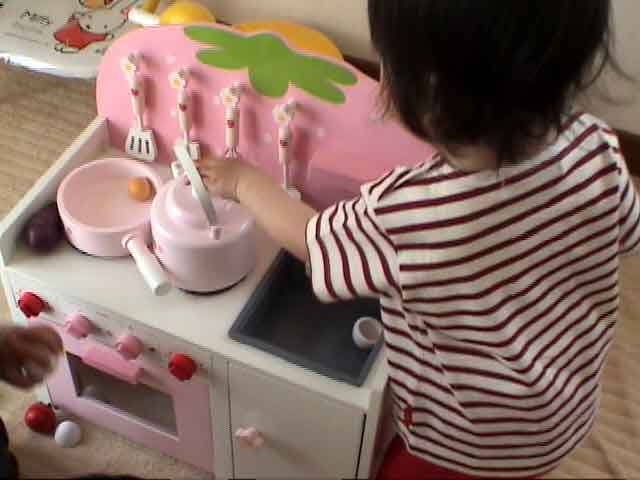 ![]() お友達からシステムキッチンをプレゼントしてもらったよ!本物そっくりで、ママはびっくり!! |
