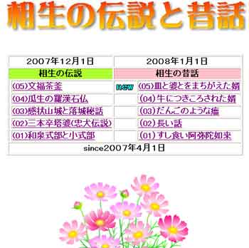 | 2007年4月1日に、相生市教育委員会の担当の2人の方と協力しながら、「相生市の伝説と昔話」の第1号をアップしました。 2008年1月(写真(1))には、正月のご祝儀もあったのか、ヤフーの検索エンジンで「伝説と昔話」と入力すると、何と394万件の5番目にランクされるようになりました。 | ||||||