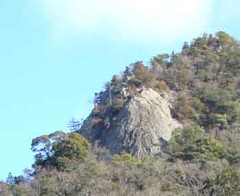 | 2008年2月1日にアップするのは、相生市矢野町の磐座神社の巨岩伝説です。『相生市史』にも「郷土のあゆみ」にも紹介されています。 磐座神社の背後にそびえる山を権現山といいます。権現山には、天から神が降りたという伝説上の巨岩があり、地元の人は露出した巨岩を「天狗岩」(写真(2))と呼び、朝な夕なに拝んでいたといいます。 | ||||||