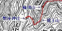 龍王山から権現山へは、急勾配です。古木の枝を握って一歩前進するも、その枝が枯れていたり、岩の角を頼りに一歩前進するも、もろくも崩れたりの連続です。左右は、断崖絶壁で、体をくい止める物は何もありません。四つんばいの哀れな姿で登るしかありません。
