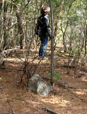 やがて、使いふるした山道に出会いました。所々、山道が消えていましたが、とんび岩さんの地図(写真(3))から大体の方向性を確認して進むと、再び山道に出会いました。2万5000分の1の地図と方向線は、本当に、威力を発揮します。 |