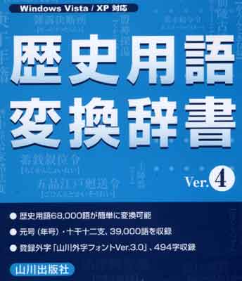 | (1)歴史用語変換辞書バージョン1は、2001年に発売されました。私の在職中の最後の大仕事となりました。この時は、日本史の用語集と世界史の用語集のみでした。 (2)私は、2002年3月末に退職しました。 (3)歴史用語変換辞書バージョン2は、2003年に発売されました。この時は、日本史の用語集(約1万2000語)と世界史の用語集(約1万1000語)と、要望にこたえて外字を73字作成しました。 (4)歴史用語変換辞書バージョン3は、2005年に発売されました。この時は、新しい教科書に合わせて、日本史の用語集(約3万9000語)と世界史の用語集(約2万9000語)を大幅に改定し、郷土史家の要望にこたえて、元号(年号)を約3万9000語、外字を494字作成しました。 (5)歴史用語変換辞書バージョン4は、2008年に発売されました。用語・元号(年号)・外字はバージョン3と同じですが、Windows Vistaに合わせて、Vista版となっています。 | ||||||||||||||||||||||||