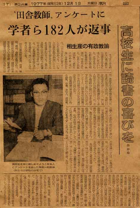 相生産業高校は普通、商業、被服、機械、造船の各があり、生徒数は約九百五十人。同校で日本史を教えてい有政一昭教諭(三五)は授業を始める前に、尊敬する人物や感銘を受けた本をあげさせてみたが、生徒の日から出るのはリンカーン、野口英世など小学校の教科書に出てくる人物やその伝記ばかりだった。そこで高校時代に読むべき本を読ませるためにと思いついたのがこのアンケート。はがき代や印刷費三万七千円は自弁で八月から往復はがきを出しはじめた。