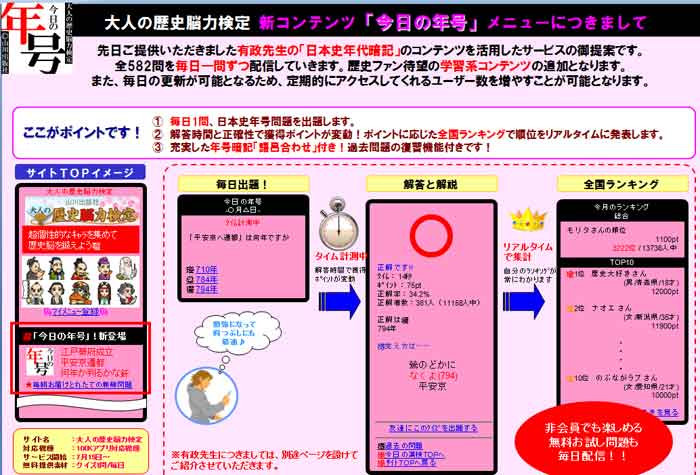 ◆NTTドコモ:iMenu⇒メニューリスト⇒ゲーム⇒クイズ/学習/検定⇒大人の歴史脳力検定