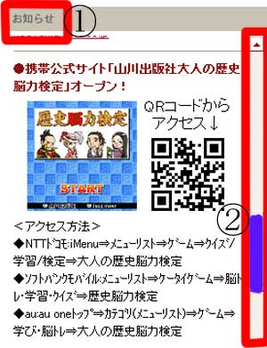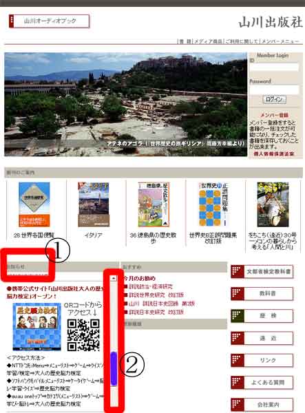 | (1)「山川出版社へリンク」をクリックすると、写真(1)が表示されます。 (2)@「お知らせ」の右のスクロール・バーをAの位置まで下げます。 |