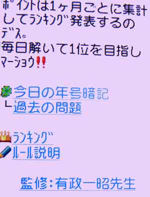 | こういう画面が出ると、「今日の年号暗記」をクリックしてください。 ここまで進むには、以下の方法を参照してください |