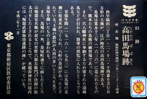 この碑は、1918(大正7)年に、高田馬場跡地の民家の庭に建立されたが、現在は30bほど離れた水稲荷境内に移されている。 |