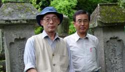 堀内伝右衛門夫妻の墓を背に