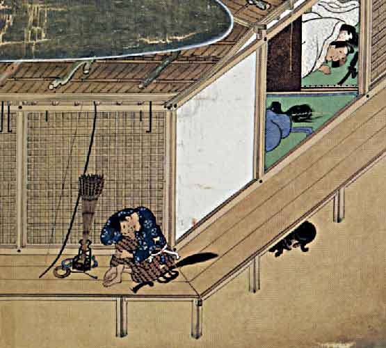 | 蛍子「えーっ。それって、どういうことですか」 土井瑠「今でこそ、侍・ジャパンとかサムライ・ブルー(W杯サッカー日本代表選手のユニホームの色)とか言っているけれど、平安時代の侍はつらい仕事をしていたんだよ」 あこな「つらい仕事?」 土井瑠「写真(3)を見ると、左下の軒先に居るのが平安時代の侍の姿なんだよ。右上の布団の中に居るのが主人の貴族なんだ」 葉月「どきっとする絵ですね。もっと詳しく説明して下さい」 土井瑠「そうだね。刺激に強い絵かも知れないね。吉良家の先祖を探るというテーマと外れるが、吉良家の歴史を知るには、日本の歴史を知る必要があるということからすると、大切なことだね。侍の歴史を知るには欠かせない絵なんだ」 妻の出したコーヒーとお菓子を食べながら、 土井瑠「サムライという字は侍と書くね。侍の動詞は『侍らふ』で、貴族に仕えるという意味でなんだ。写真(3)を説明すると、貴族が妻の家に行き、寝ている間、軒下でじーっと待っているサムライの姿なんだよ」 あこな「ということは、貴族からすると、サムライは番犬のような立場ってことですか」 土井瑠「その通りだね。その証拠がこの絵巻ということになるね」 葉月「余談なことですが、夫が妻のところへ行くという意味が分かりません」 土井瑠「これも、当時の歴史を知らないと、意味が通じないかも知れないね。当時は、妻問婚(つまどいこん)といって、子供は母親の元で成長し、大人になった男子が他家の娘の元に通うという結婚形式だったんだよ」 蛍子「貴族から見下げられていた源義家は、武力で貴族の仲間入りをしたということがよく分かりました」 あこな「サムライにも主人が帰るまで軒下でじーっと待っている時代があったなんて、びっくりです」 | ||||||||||||||||||||||||||||||||||||||||||||||||||||||||||||||||||||||||||||||||||||||||||||||||||||||||||||||||||||||||