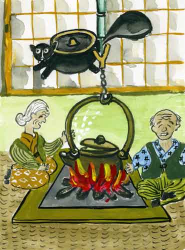 いたずらなタヌキを捕まえたおばあさんは、おじいさんが帰るまでタヌキ汁の用意をして待っていましたが、タヌキにだまされ、杵でなぐられて大怪我をします。
